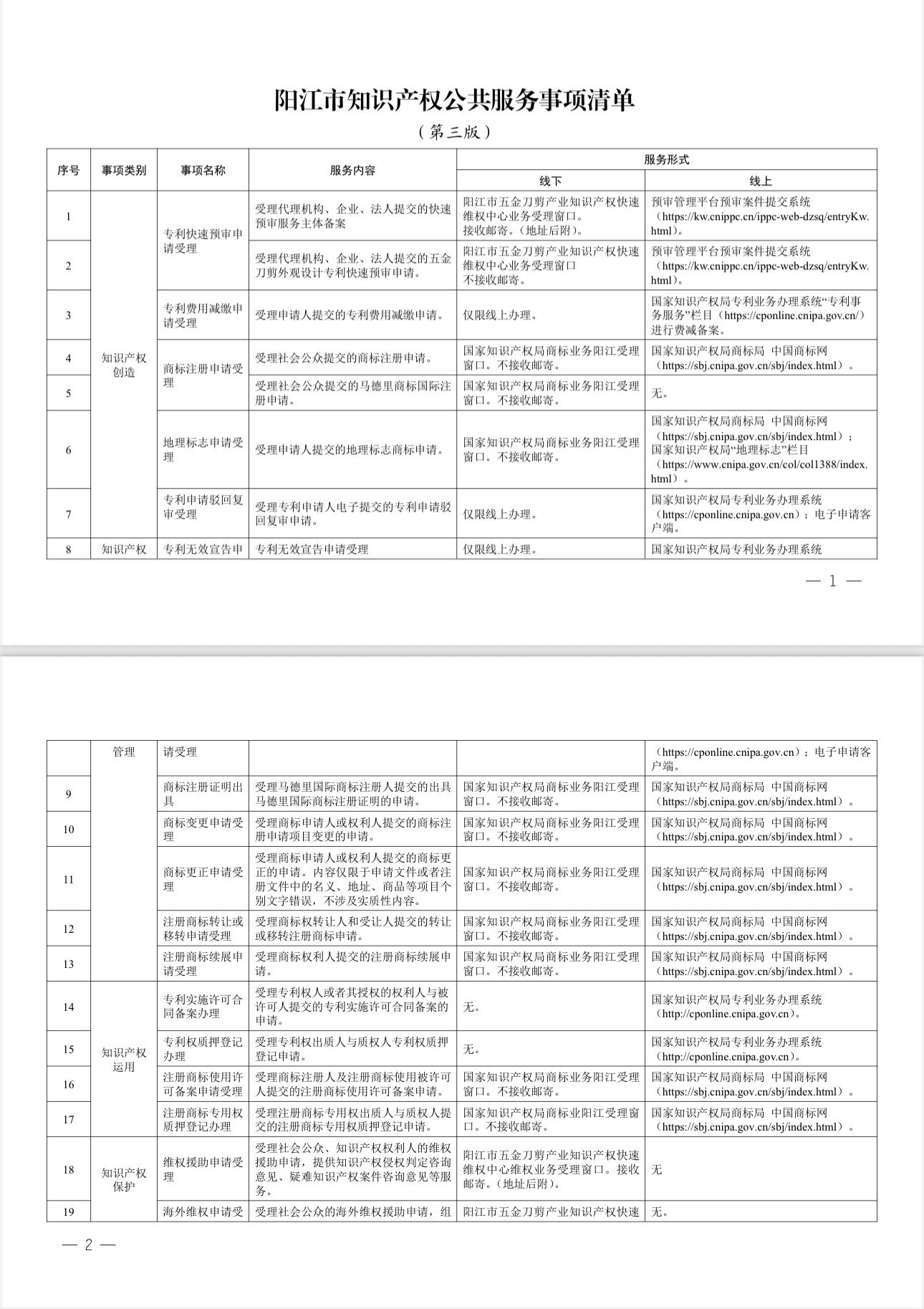 为落实知识产权公共服务普惠工程,提升知识产权公共服务效能,市市场监管局(市知识产权局)在原有知识产权公共服务事项清单的基础上进行了优化完善,发布《阳江市知识产权公共服务事项清单(第三版)》(以下简称清单《第三版》),进一步方便我市创新主体和社会公众了解知识产权相关政策、办理知识产权相关事务,持续优化营商环境。